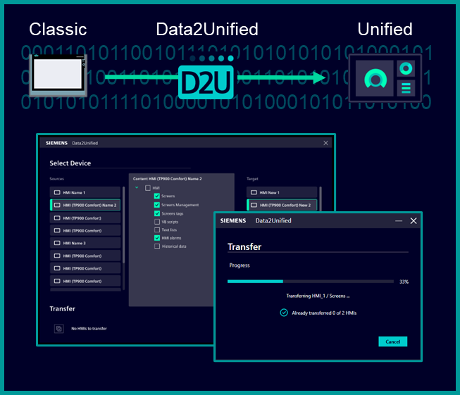 Data2Unified es una herramienta diseñada para facilitar la transición desde entornos HMI anteriores hacia WinCC Unified. Su objetivo principal no es migrar proyectos completos (esto sólo ocurrirá en aplicaciones muy sencillas), sino reutilizar información existente para reducir el esfuerzo requerido para la migración.