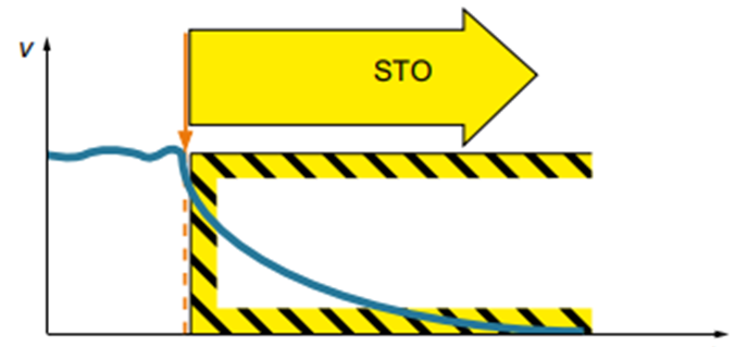 Safe Torque Off (STO) interrumpe de forma inmediata el suministro de energía formadora de par o fuerza al motor. Si al activar STO el motor aún está girando, se detendrá por inercia, como se muestra en la Figura 1.