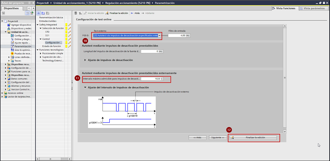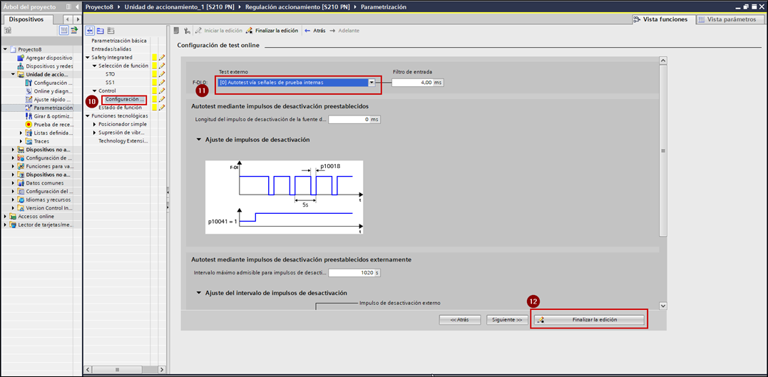 Finalmente, seleccionamos el autotest “vía impulsos de desactivación especificados en VS+” y ajustamos el filtro de entrada y el tiempo del impulso de desactivación. Una vez completado, finalizamos la puesta en marcha (Figura 6).