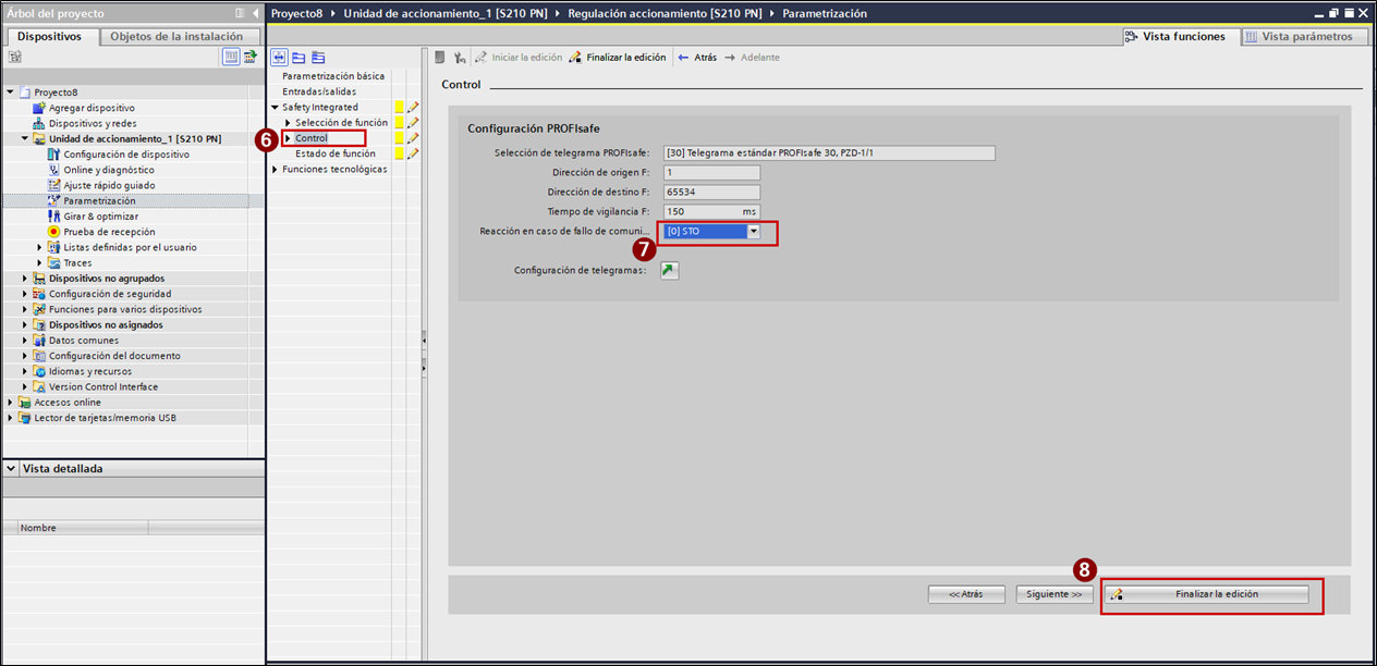 Posteriormente indicamos la reacción en caso de fallo (Figura 13). Una vez seleccionado STO y revisada la dirección PROFIsafe, finalizamos la puesta en marcha.
