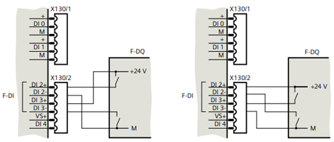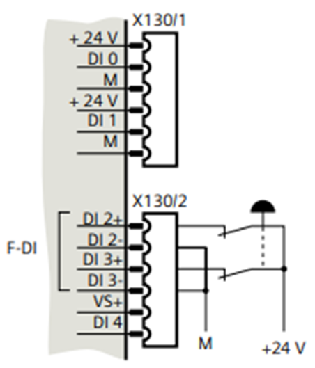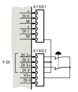 El cableado de las entradas de seguridad F-DI (DI 2 y DI 3) con el terminal VS+ se muestra en la figura 3.
